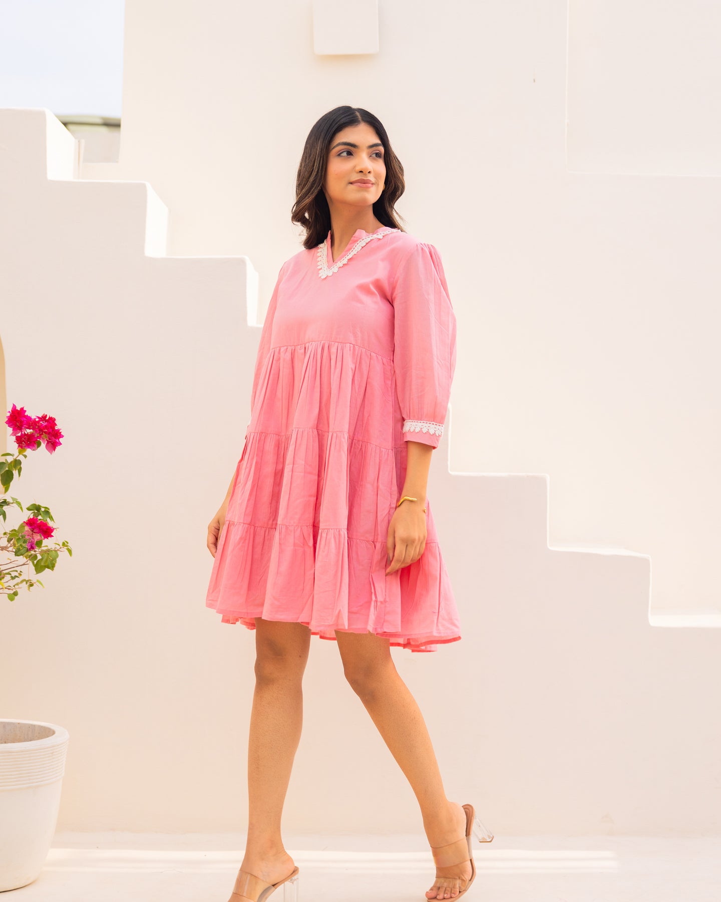 Soft, airy, and effortlessly stylish — this light pink mulmul dress is designed for everyday elegance. With its V-neckline, three-quarter sleeves, and fit and flare silhouette, it offers comfort with a refined edge for your casual moments.